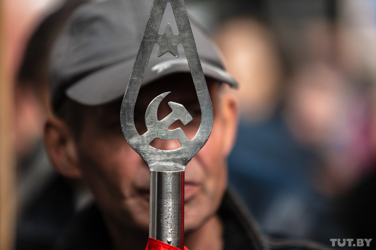 — Миленькие мои! В десять раз больше пришло бы людей, если бы не эти портреты. Флаг Беларуси должен быть, армейское знамя, но не портреты Сталина, — еще пытается докричаться она.