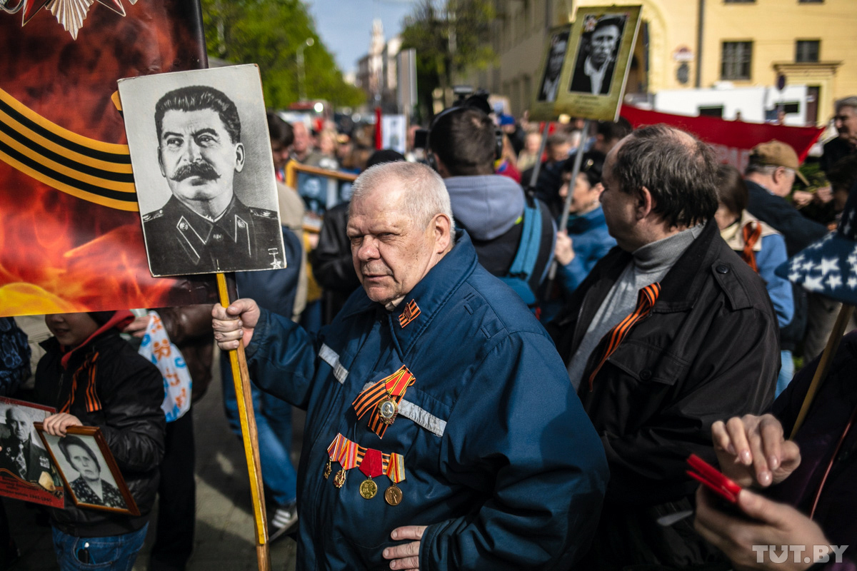 «Победа наша была общая, всего советского народа, поэтому делить ее по национальным квартирам неправильно», — говорит Василий Зеликов, один из организаторов акции, которую в прошлом году минские власти сперва запретили и разрешили только в последний момент. Он стоит у растяжки с цитатой Сталина, рядом его единомышленники держат портреты вождя. Участники «Бессмертного полка» собираются у Дома-музея РСДРП, в нескольких метрах от площади Победы. Подняться наверх им разрешат, когда торжественная часть закончится. Мимо пробегают школьники с портретами ветеранов, им — на официальную акцию «Беларусь помнит», главное — не перепутать.