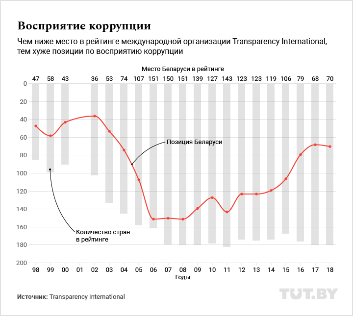 Па данным международной организации по борьбе с коррупцией Transparency International, по сравнению с началом 2000-х уровень коррупции у нас снизился и закрепился примерно на одной позиции. Инфографика: Антон Девятов, TUT.BY.