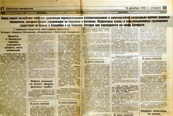 Статья называлась крайне необычно даже по меркам 90-х: «Народ нашей республики перестал удивляться перевоплощению столоначальников в коммерсантов, роскошными виллами рядовых чиновников, поездкам семей управленцев по Парижам и Багамам. Мафиозные кланы и коррумпированные группировки существуют не только в Колумбии и на Сицилии. Сегодня они зарождаются на земле Беларуси».