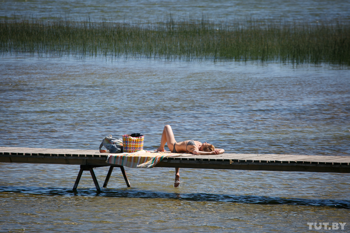 Женщина загорает на озере Нарочь. Фото: Вадим Замировский, TUT.BY