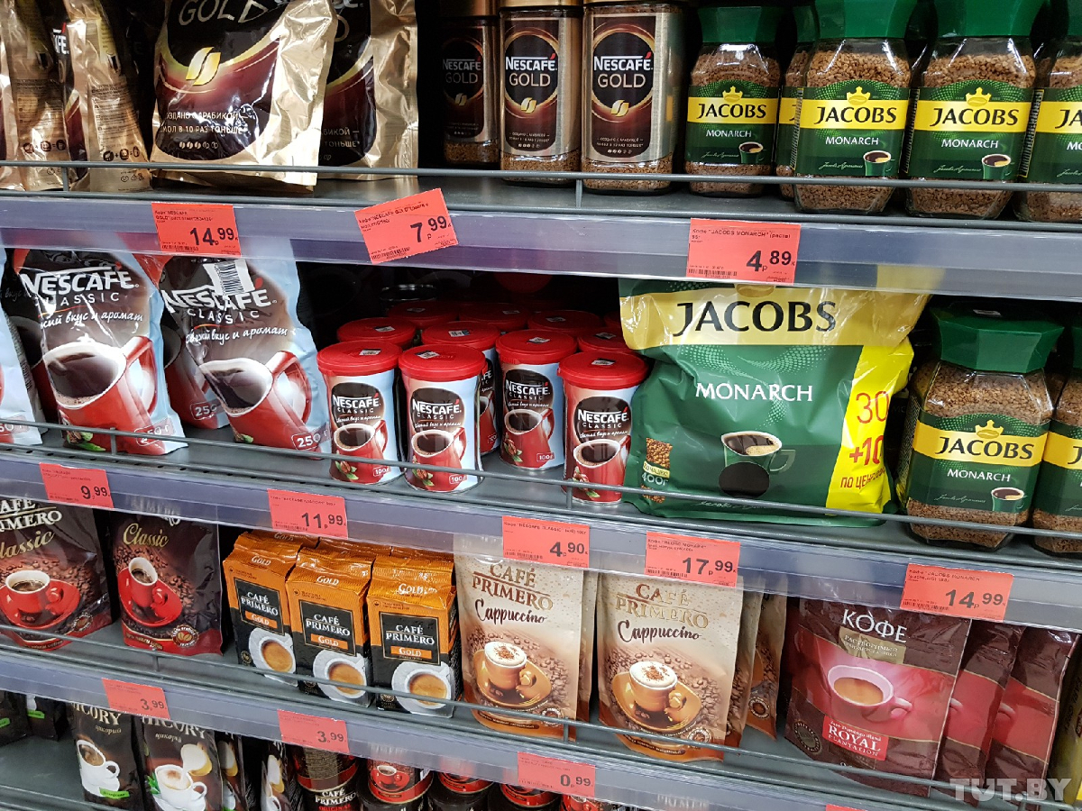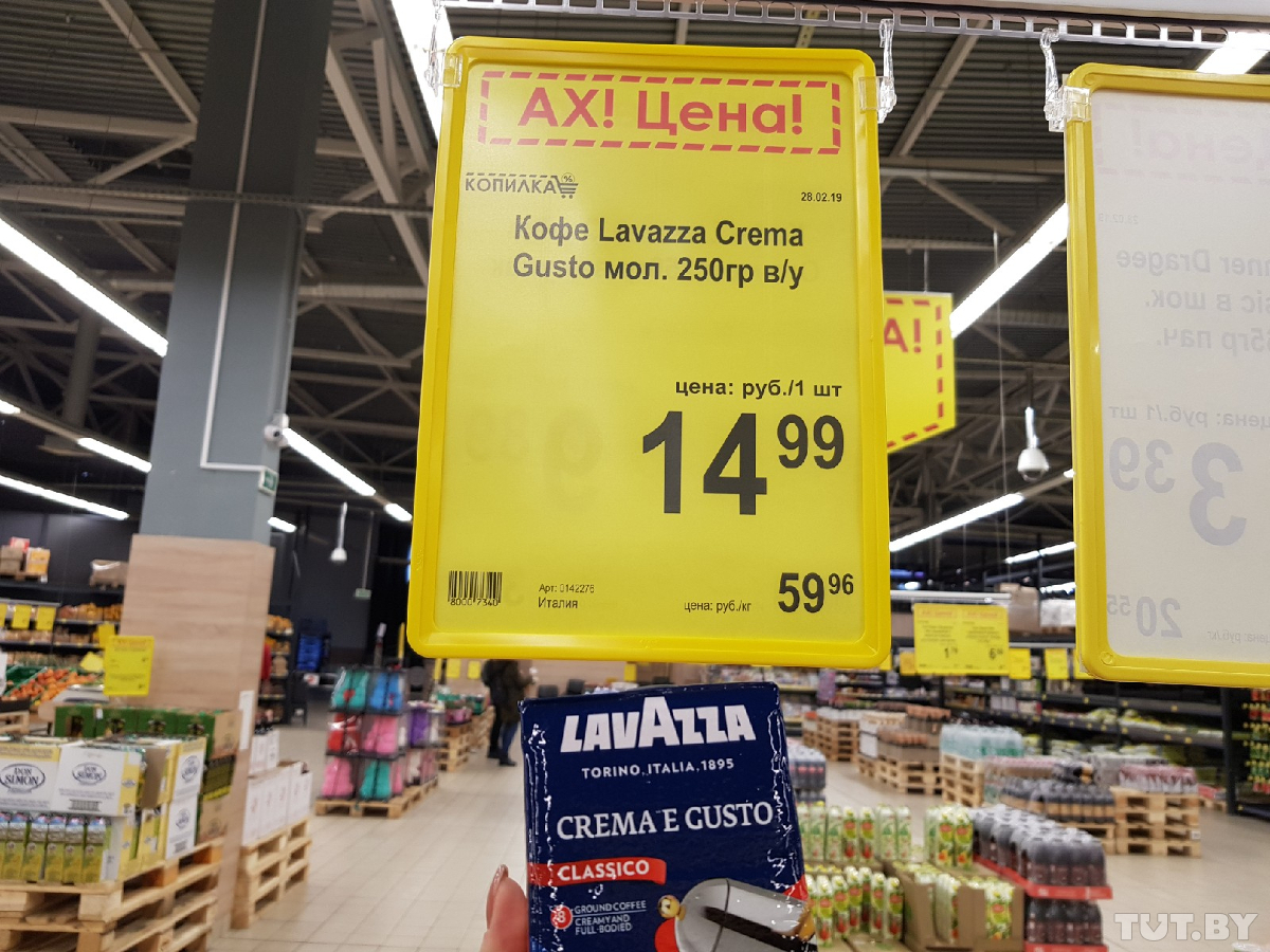 В магазине встречаются люди, которые фотографируют ценники. Сравнивать есть с чем: буквально через дорогу работает гипермаркет «Евроопт». Сравним несколько акционных товаров «Копилки» с ценами в соседнем магазине: коробка конфет Raffaello стоит столько же, а пачка кофе Nescafe весом в 75 граммов — лишь на 40 копеек дешевле.