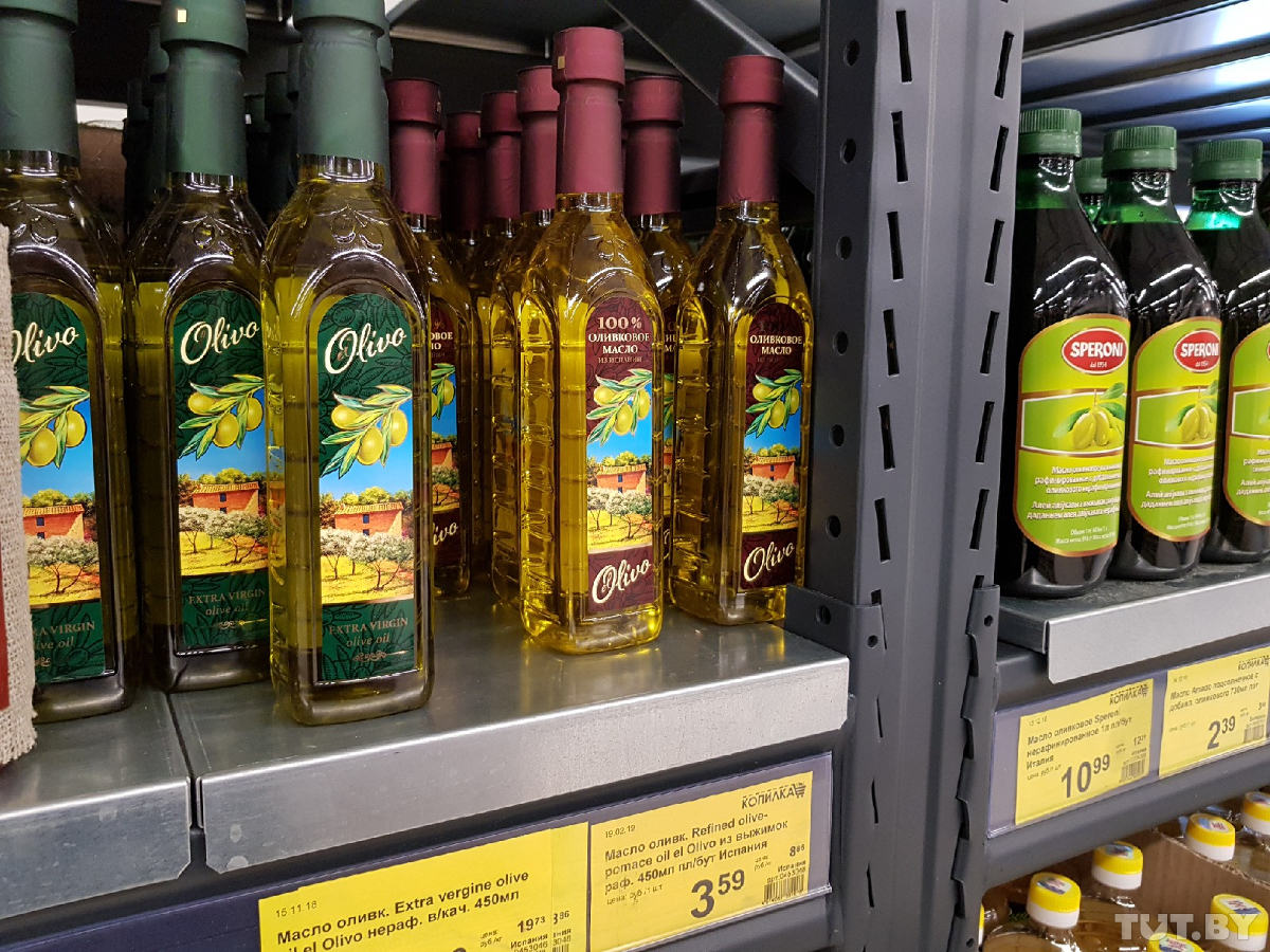 Оливкового масла выбор небольшой, но все по цене от 6,99 до 11,99 рубля. В другом столичном магазине на эти же позиции цена выше на 1−2 рубля. Консервированные оливки и маслины тоже недорогие — до 1,79 рубля.