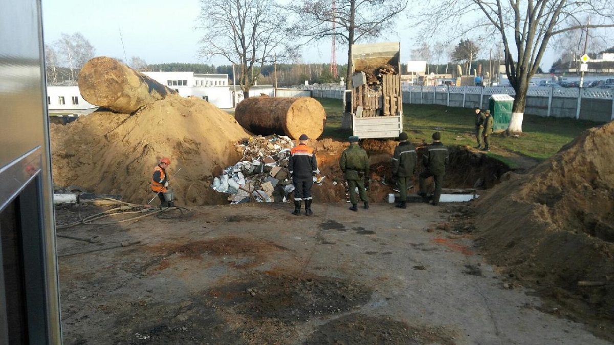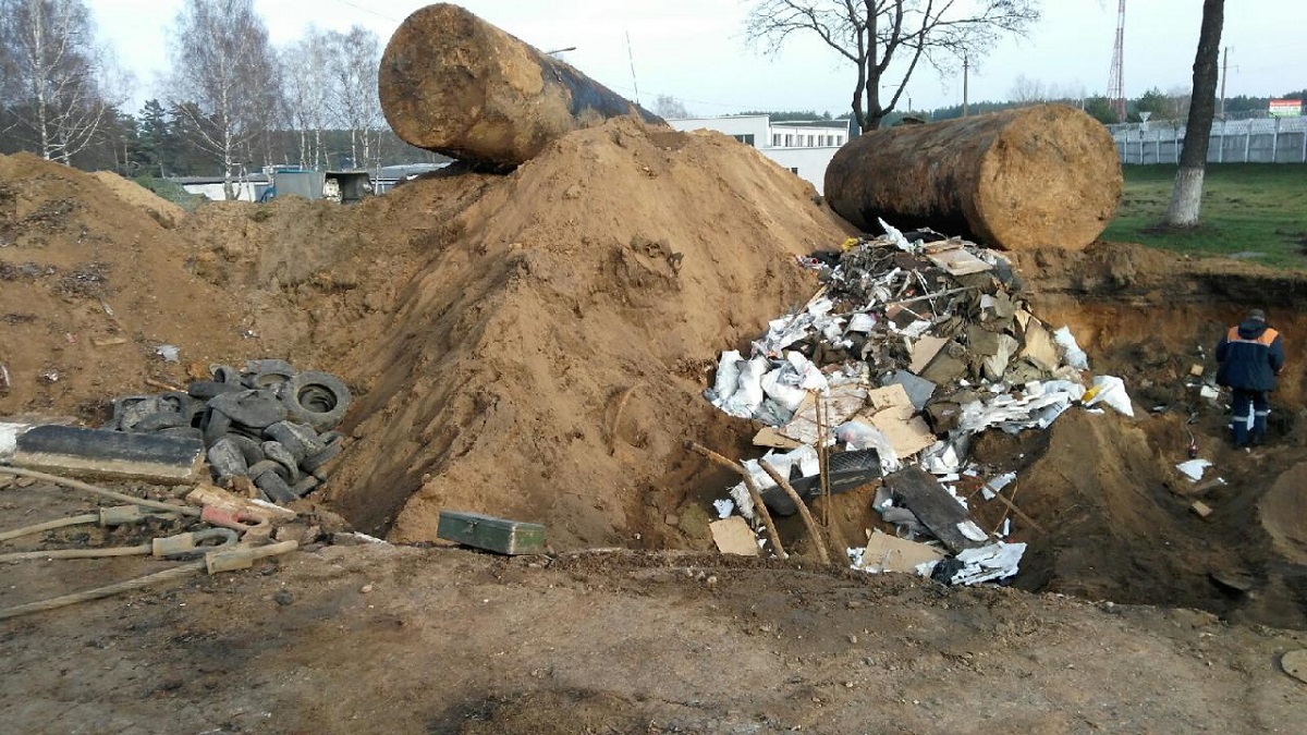 На вершине раскопа — те самые цистерны для топлива, которые выкопали из земли. Фото: пользователь TUT.BY