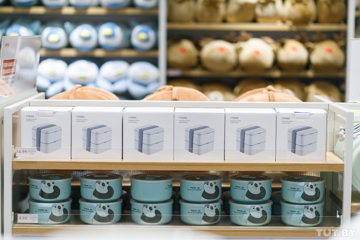 Среди товаров в первом минском магазине бренда можно найти вещи для дома, технику, сувениры, игрушки, канцелярские товары, косметику. За рубежом в таких же магазинах продается и китайская еда.