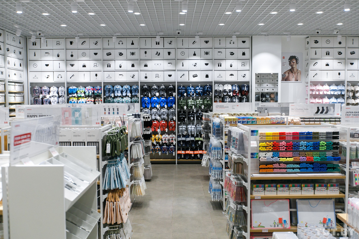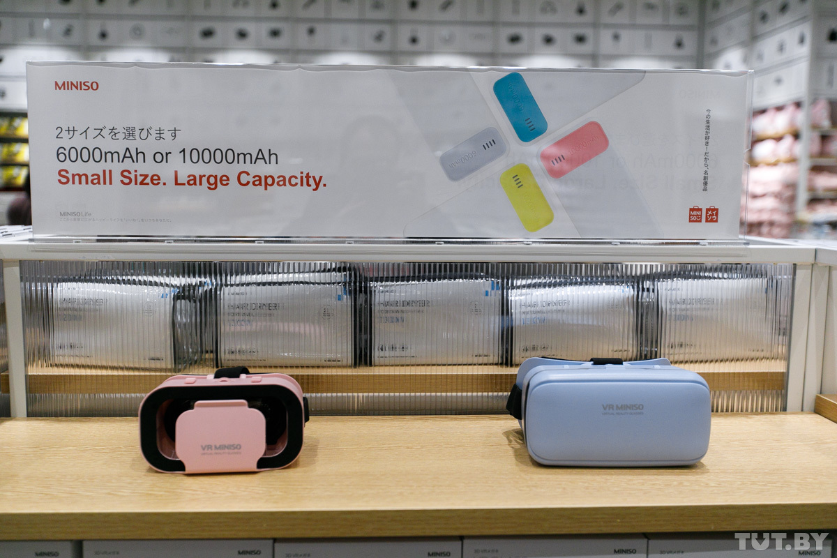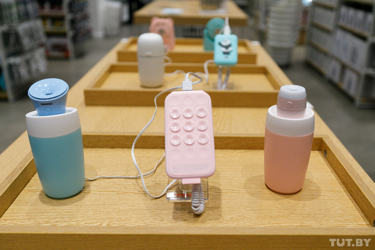 В первом белорусском магазине Miniso большие наушники стоят 27 рублей, портативные колонки — от 33 до 78 рублей, портативное зарядное — 28 рублей, электрический чайник — 55 рублей, VR очки — от 17 до 28 рублей. Кроме техники есть и бытовые мелочи вроде корзинок для хранения вещей, которые соседствуют с посудой, столовыми приборами, косметикой, женскими сумками и некоторыми предметами одежды. Вещи, которые продают в магазине, произведены в Китае, Тайване, Таиланде, Германии и США.