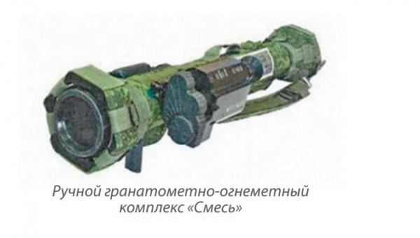 Минобороны России рассекретило облик нового ручного гранатометно-огнеметного комплекса «Смесь», сообщает ТАСС. Изображение комплекса опубликовано в тематическом сборнике «Ракетно-техническое и артиллерийско-техническое обеспечение Вооруженных Сил Российской Федерации — 2018».