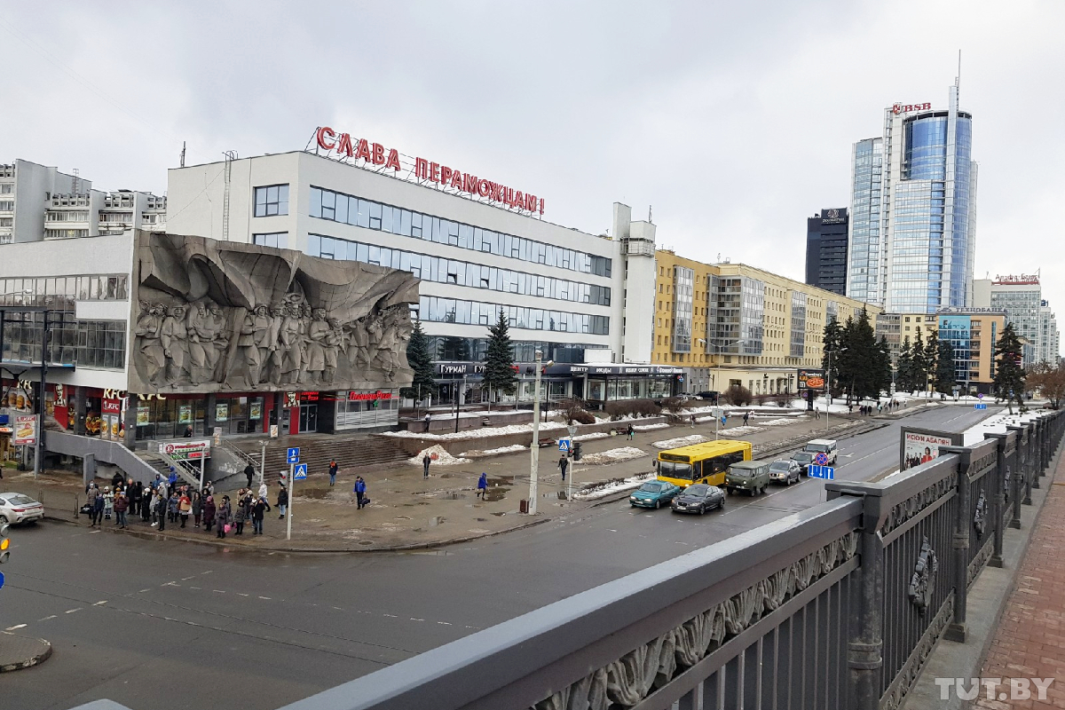 По этим фото также можно заметить, как изменилась эта часть города. Напомним, в 2017 году власти решили поменять облик проспекта Победителей. В связи с этим уже сейчас заметны внешние преобразования улицы. На здании появились буквы «Слава пераможцам!», идет реконструкция «Центра моды», упорядочены вывески. За полтора миллиона долларов переделали и мост.
