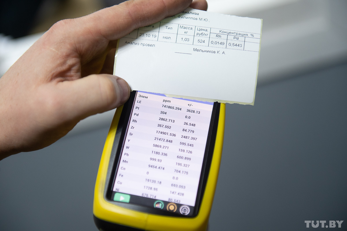 В другом помещении — но все так же в зоне контроля владельца — ведущий инженер-химик Константин Мельников помещает отобранную пробу в рентген-флуоресцентный спектрометр. Через несколько минут программа выдает результат: автовладелец получает протокол испытаний с информацией о содержании драгоценных металлов.