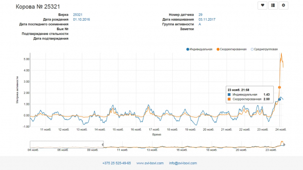 А еще в датчики Ovi-bovi встроены NFC-сенсоры — если коснуться их смартфоном, на нем сразу же откроется веб-страница коровы, связанной с этим датчиком. А вот как выглядит детализированная информация об активности каждой коровы с пятиминутным интервалом: