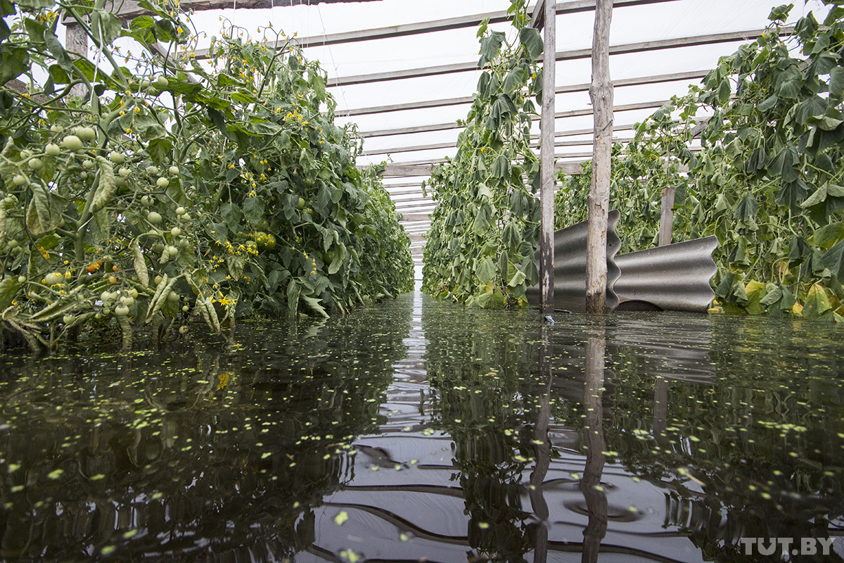 У жителя Белоуши Михаила ситуация еще хуже — из 10 тепличных соток затопленными оказались восемь. Огурцы, помидоры, перцы, которые успели созреть, сельчанин собирает в рыбацких сапогах. Возле входа в теплицу воды по колено, у дальней стены — по пояс. Залило также картофельные грядки и голубику.