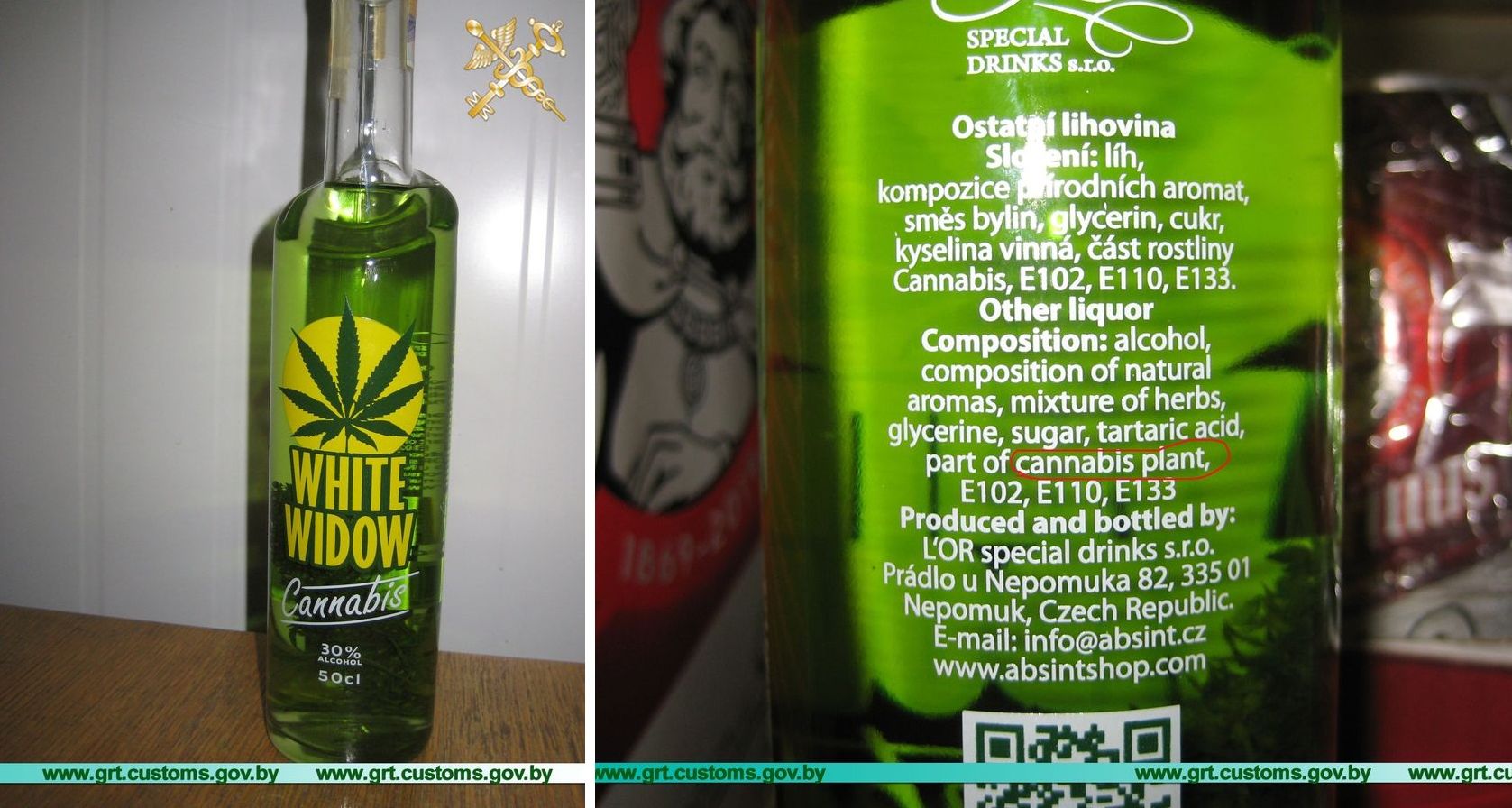 Гражданин России пытался провезти через границу на территорию ЕАЭС алкогольный напиток. Таможенников насторожила надпись Cannabis на этикетке и части растения внутри.