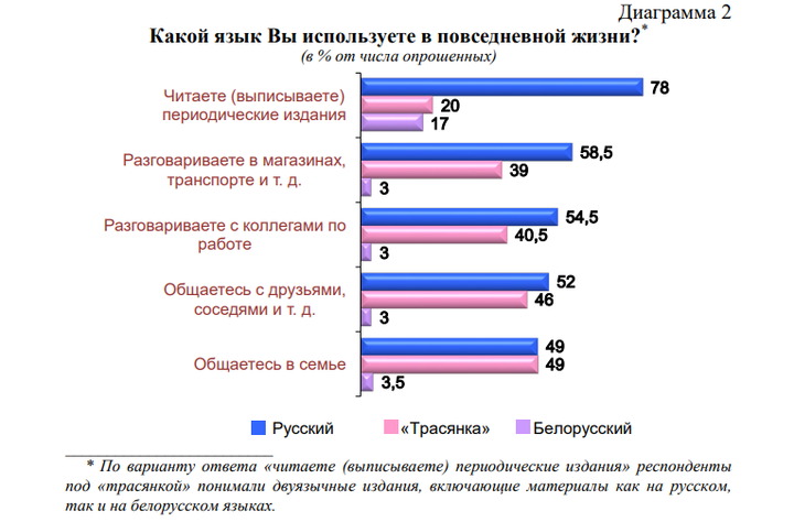 В повседневной жизни белорусы чаще всего выбирают русский язык — от 49 до 78% граждан. Многие, а это 43,5% опрошенных, общаются на так называемой трасянке — на ней разговаривают в магазинах, транспорте, на работе, с друзьями, в семье и т.д. Интересно, что в семье белорусы общаются поровну как на русском языке, так и на трасянке (по 49 процентов, и лишь 3,5% — на белорусском).