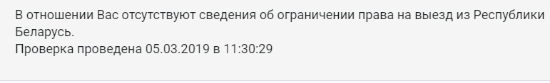 После регистрации можно попасть в личный кабинет на сайте, где нужно выбрать строку «Проверка ограничения выезда из Республики Беларусь». В список невыездных, напомним, могут попасть подозреваемые или обвиняемые по уголовному делу, уклонисты, те, у кого есть долги по алиментам, неоплаченные штрафы, люди, которым предъявлен гражданский иск в суде. Ответ на сайте можно получить моментально.