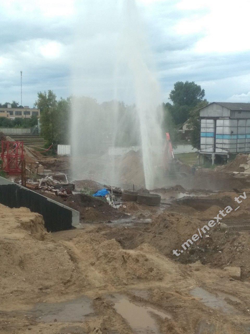 На стройплощадке Полоцкого путепровода в Витебске прорвало трубу — из нее вверх бил огромный «фонтан» воды. Инцидент произошел вечером 11 июля. Фото и видео происшествия опубликовал телеграм-канал NEXTA. В УКС Витебского облисполкома, который выступает заказчиком строительства путепровода, уверяют, что ситуацию «даже нельзя назвать аварией».