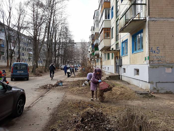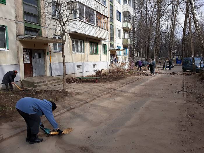 На субботник вышли 27 человек, половина из них — пенсионеры. За 2 часа добровольцы убрали двор от старой листвы и мусора.