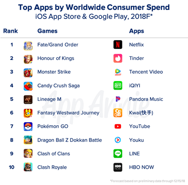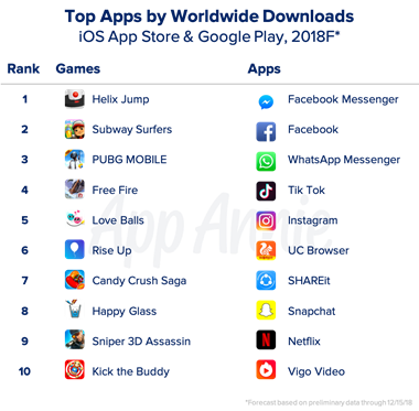 В App Annie также отметили, что в 2018 году совокупное количество загрузок из App Store и Google Play превысит 113 миллиардов, что на 10% больше в сравнении с результатами прошлого года. Пользователи потратили на них около 76 миллиардов долларов — на 20% больше, чем в прошлом году.