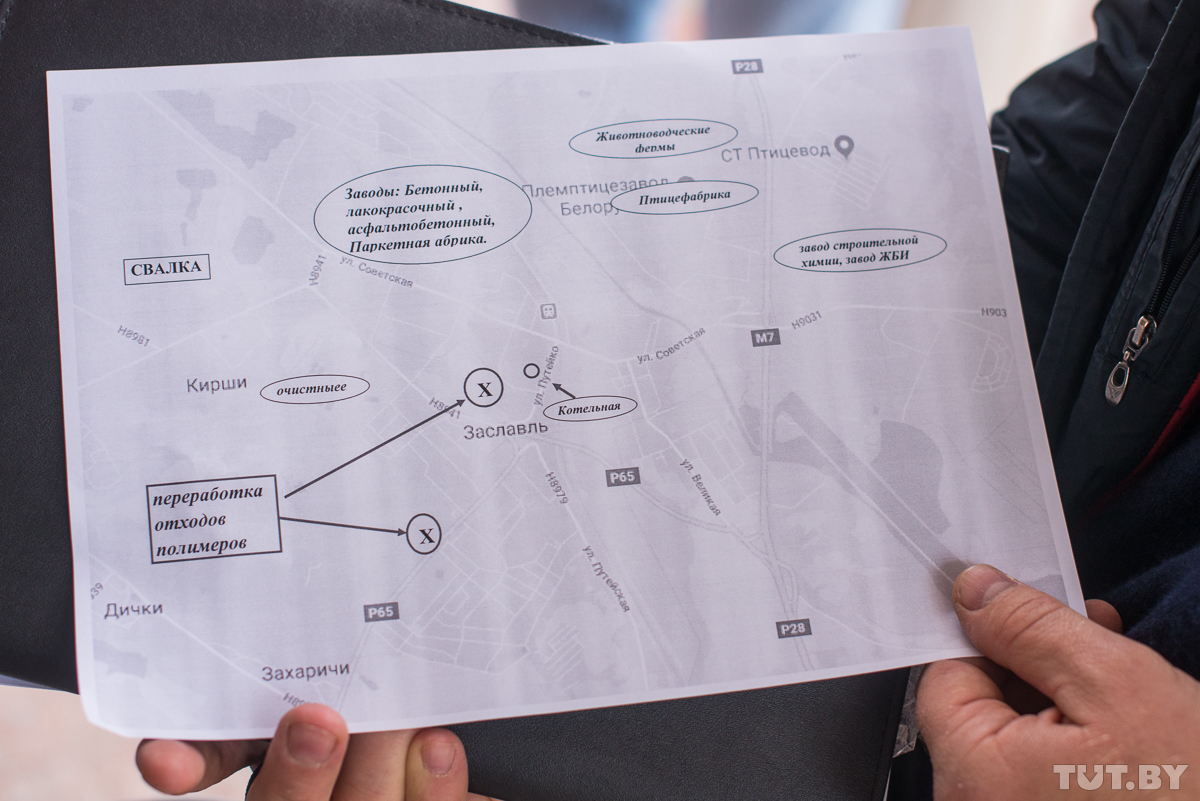 — Это схема размещения вредных предприятий в Заславле, — показывает Виталий документы. — Посмотрите, здесь и бетонный, и лакокрасочный, и асфальтобетонный, и паркетный заводы, дальше — птицефабрика, завод строительной химии и завод железобетонных изделий. А еще свалка, очистные сооружения… Все это находится в непосредственной близости от жилых домов. Почему сейчас началось движение? Потому что мы узнали, что объявлено общественное обсуждение по поводу оценки воздействия на окружающую среду двух предприятий, которые занимаются переработкой пластика. Они и раньше работали, но теперь, по новому законодательству, им нужно привести в соответствие документы, поэтому выясняют мнение местных жителей. И мы выступаем против. Нам говорят, что ухудшение экологии незначительное, но даже по представленной экспертизе в атмосферу будет попадать до 126 кг вредных веществ в год, а заводы находятся практически в центре города — на улице Гагарина и улице Дзержинской.