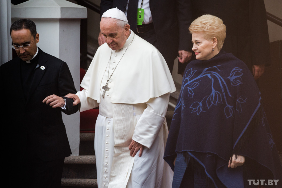 В 11.25 самолет приземляется в аэропорту. Стоило папе Франциску выйти из салона и спуститься по трапу к красной ковровой дорожке, как возле президентского дворца раздались аплодисменты. На дождь уже никто не обращал внимания. В аэропорту понтифика встречали президент Литвы Даля Грибаускайте, оркестр, военные, школьники и студенты. Увидев малышей, папа Франциск широко улыбнулся и поприветствовал их рукой.