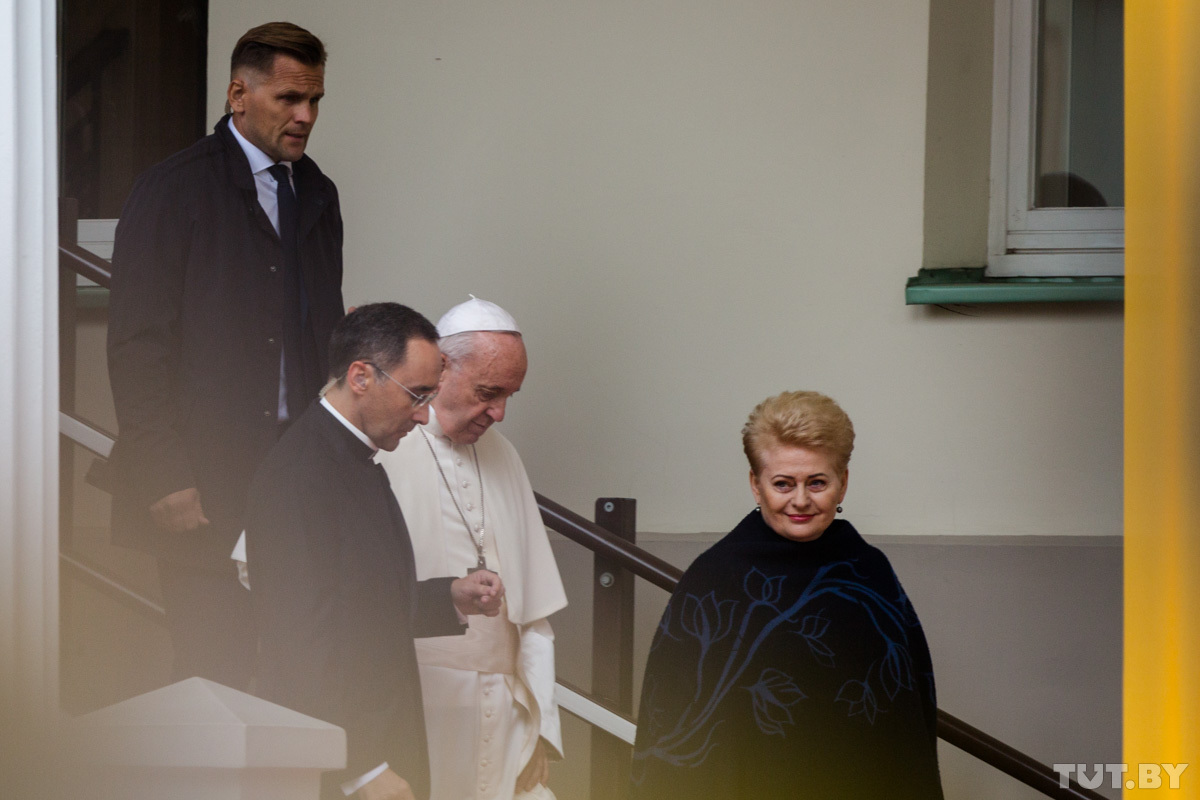 Встреча президента Литвы и папы римского тет-а-тет длилась 15 минут, затем оба вышли на сцену у дворца. Даля Грибаускайте поприветствовала понтифика по-итальянски, а затем каждый выступил с речью. Собравшимся раздали буклеты, где слова папы Франциска были переведены на литовский.