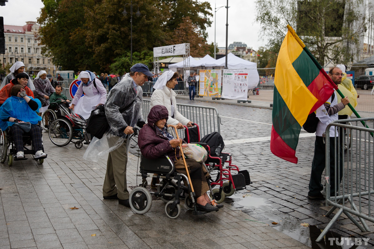 Субботнее утро в Вильнюсе началось с резкого похолодания и проливного дождя, только это не испугало верующих. Они признаются, никакая непогода не могла помешать их встрече с папой римским. Надев разноцветные дождевики, люди с самого утра спешили к Кафедральной площади, Острой браме и президентскому дворцу.