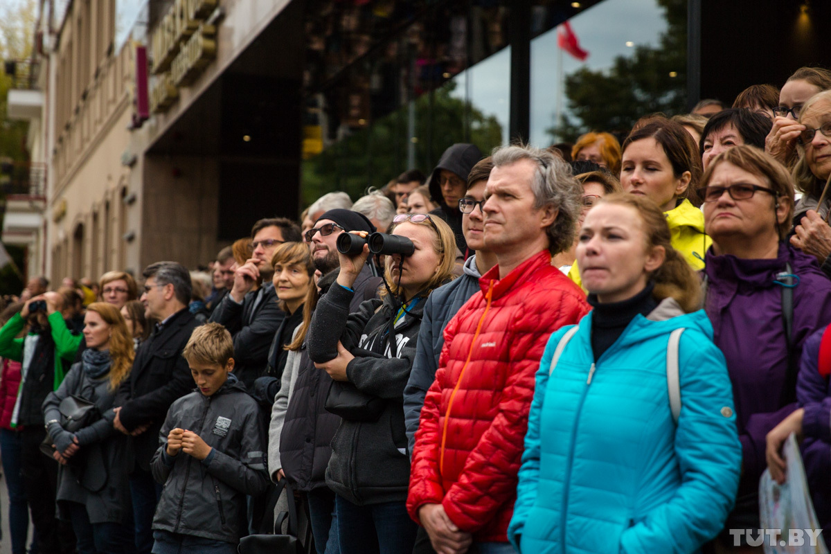 В 12.00 на площади уже тысячи людей, ближе к обеду очереди в КПП растягиваются на 100−200 метров. В среднем, чтобы попасть сюда, нужно отстоять полчаса. Во избежание давки — а здесь соберется 30 тысяч человек — вся площадь разбита на сектора. Многие берут с собой раскладные стулья, коврики, пледы, термосы и еду, ждать придется долго, а хочется занять лучшие места.