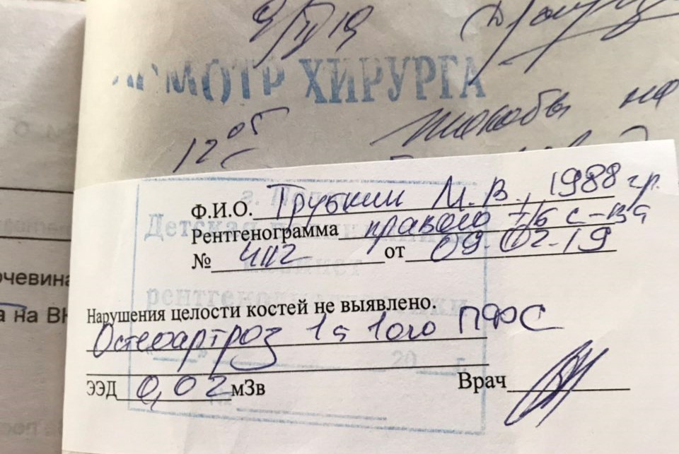 Рентгенограмма в карточке Максима Трубкина: «Нарушения целости костей не выявлено». Доктор обнаружил остеоартроз 1-й степени 1-го плюснефалангового сустава. Фото: Максим Трубкин