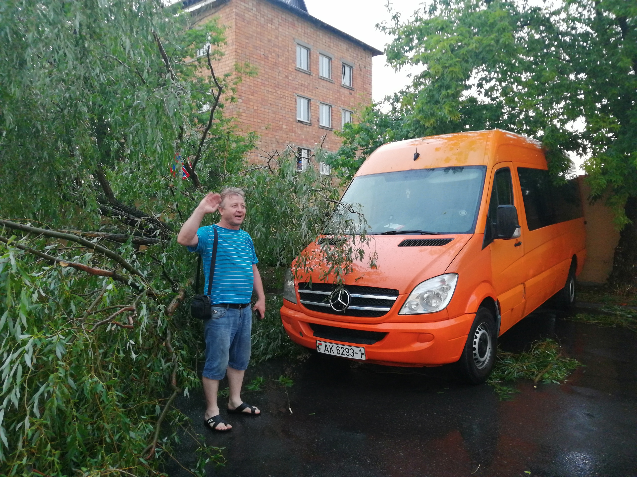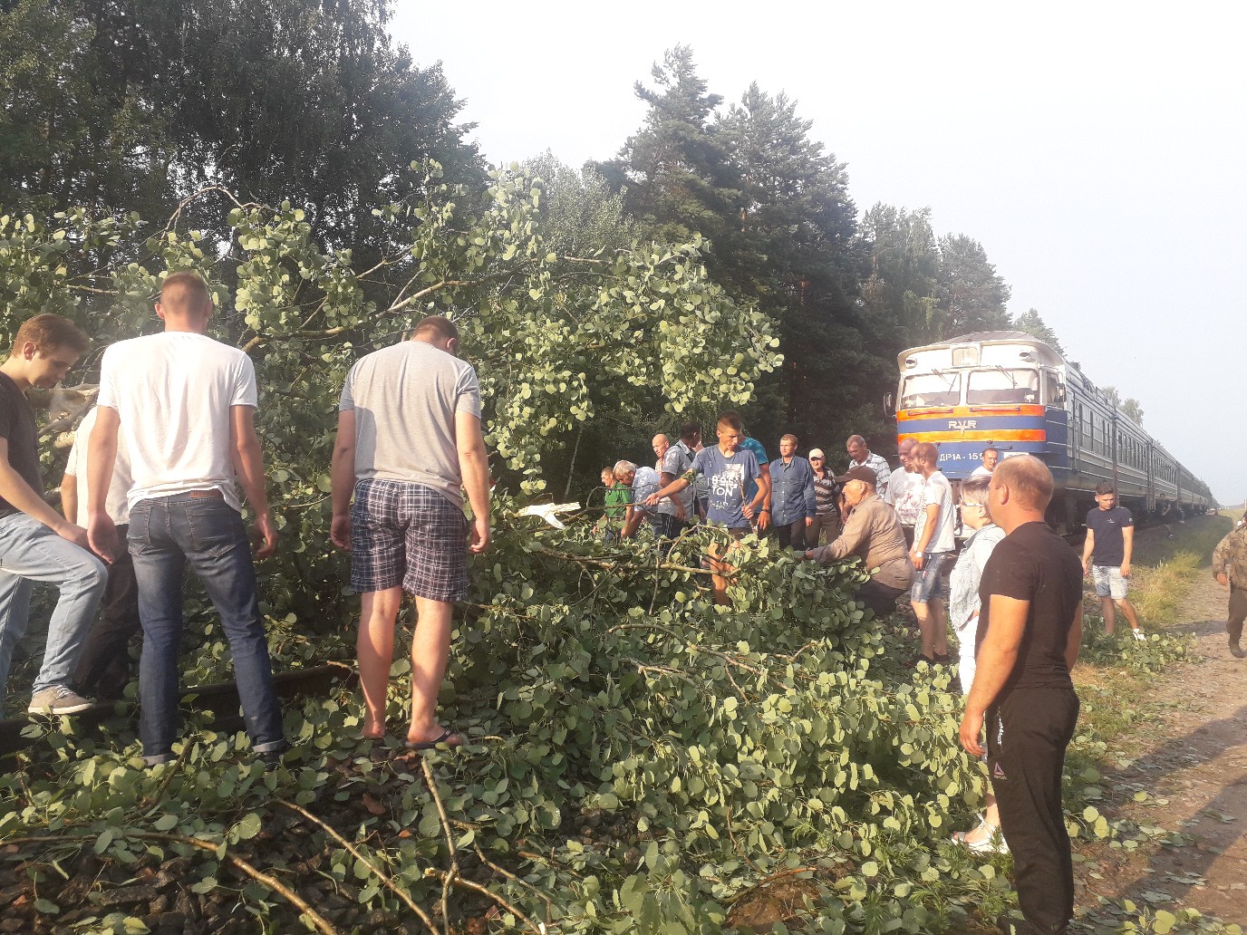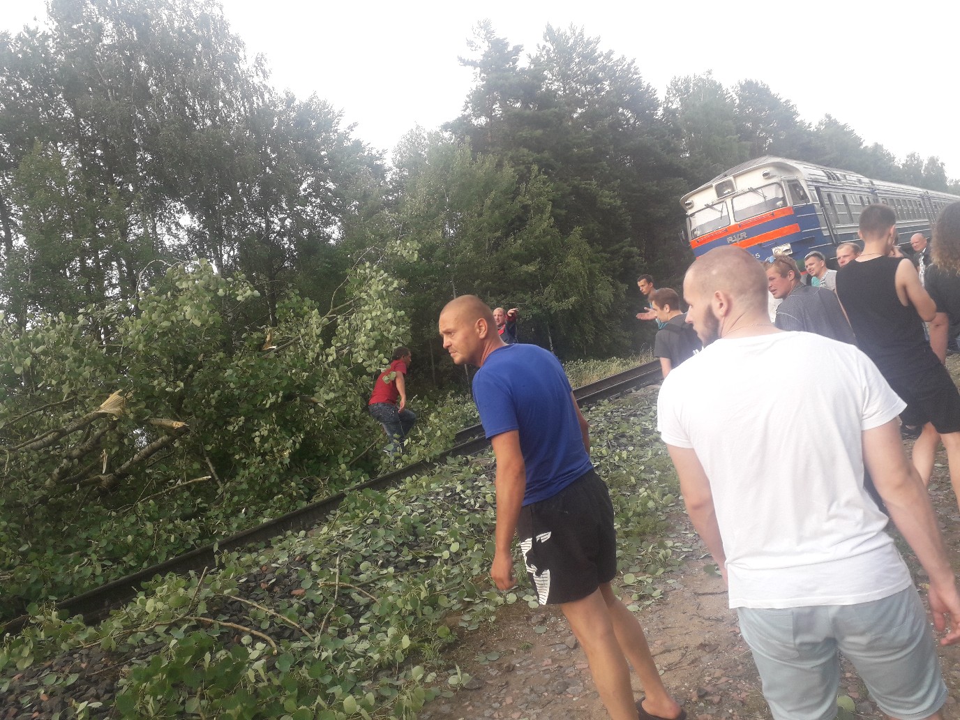 В Пинске ветер «сдул» забор и повалил несколько деревьев во дворах и на трассе, которая связывает райцентр с деревней Дубое. Кроме того, завалило и железнодорожную ветку, из-за чего не мог проехать дизель-поезд. Помогать расчищать путь вышли пассажиры.
