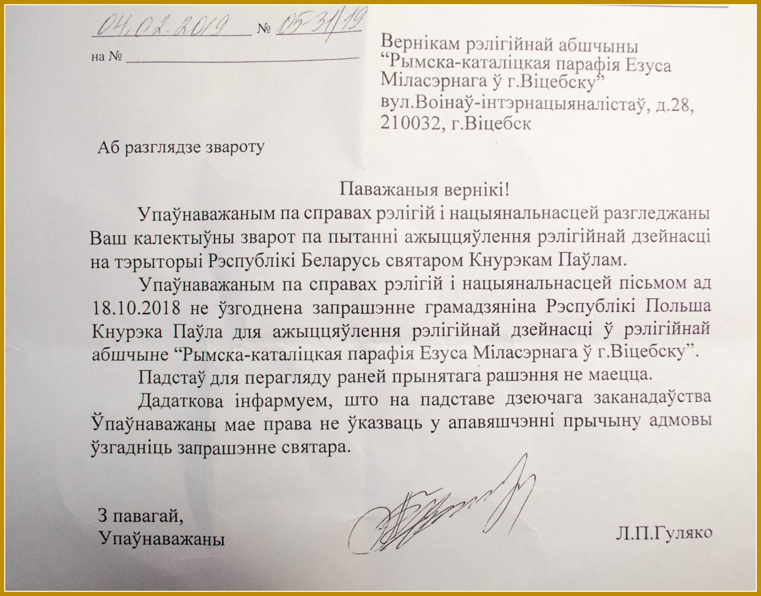 В своем ответе прихожанам Гуляко сообщил, что 18 октября 2018 года он не согласовал приглашение ксендза Кнурека для служения в религиозной общине «Римско-католический приход Иисуса Милосердного в Витебске». «Оснований для пересмотра ранее принятого решения нет», — отмечает уполномоченный по делам религий и национальностей.