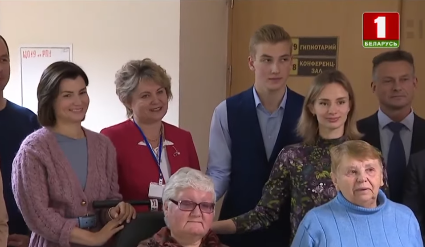 Николая Лукашенко сопровождали пресс-секретарь президента Наталья Эйсмонт, личный врач президента Светлана Коношенко, его первая учительница Мария Богомолова и другие.