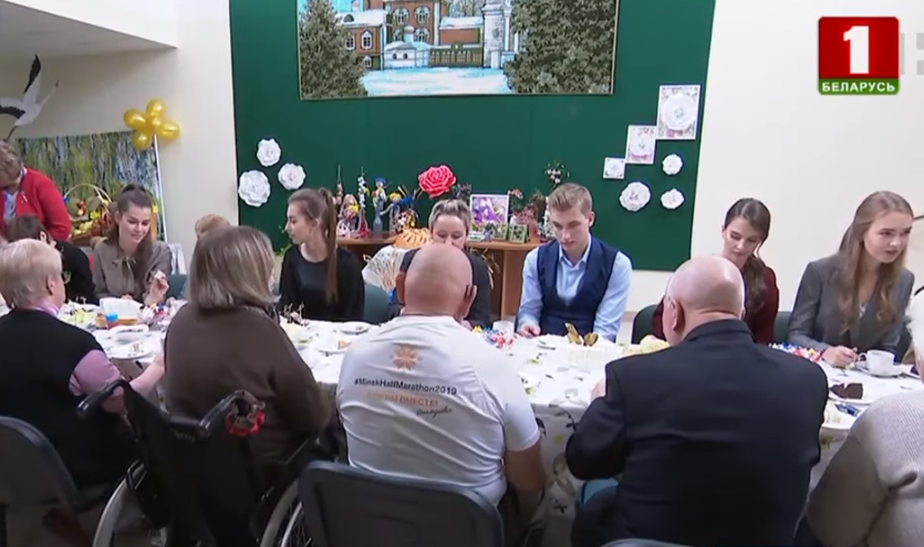 В интернате гостей пригласили за стол, где угощали привезенными продуктами. Во время застолья не обошлось без песен. Кроме того, жителям интерната подарили теплые пледы от президента.