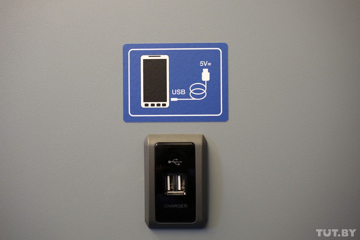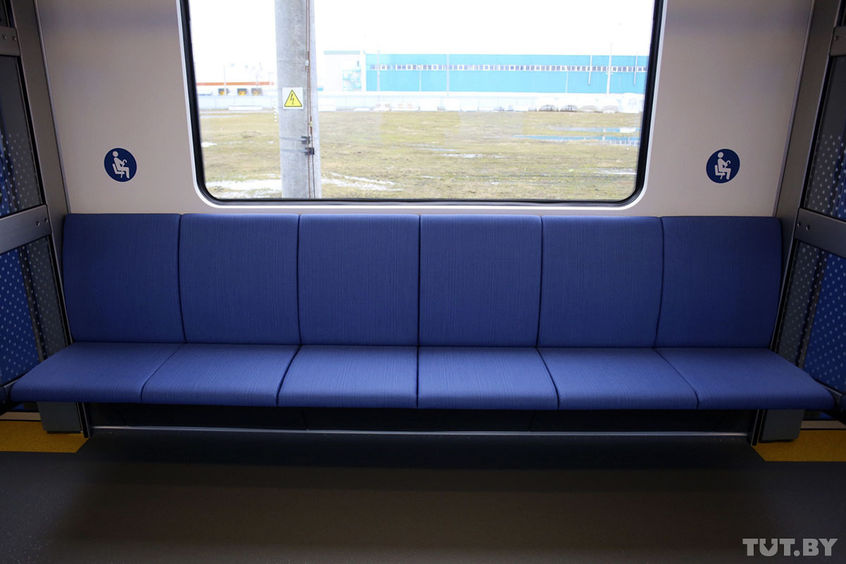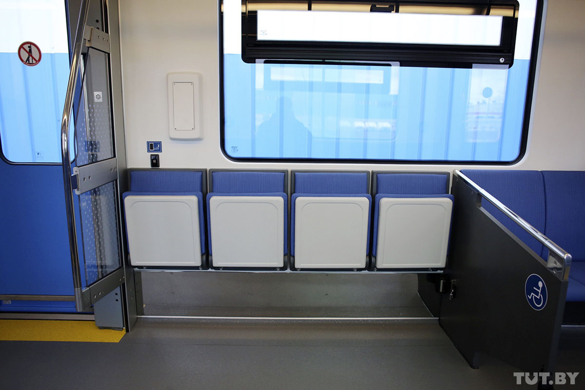 В первом поезде — четыре вагона. Между ними есть сквозной проход с широким переходом, уже рассказывал TUT.BY. В конце и в начале поезда есть зоны для пассажиров с ограниченной мобильностью, с приспособлениями для фиксации.
