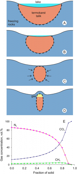 Открытый исследователями из МГУ процесс начинается тогда, когда небольшое тундровое озеро постепенно высыхает. В этот момент ранее свободное от вечной мерзлоты дно водоема начинает постепенно замерзать сверху вниз. Заледеневший грунт в верхней части такого талика образует «крышку». При этом под ней остается большое количество «размороженного» углекислого газа, часть из которого, по всей видимости, биогенного происхождения (продукты жизнедеятельности бактерий, как установили после анализов проб из воронки). Когда давление под «крышкой» достигает достаточно высоких значений, бугор взрывается, оставляя на своем месте воронку, окруженную валом.