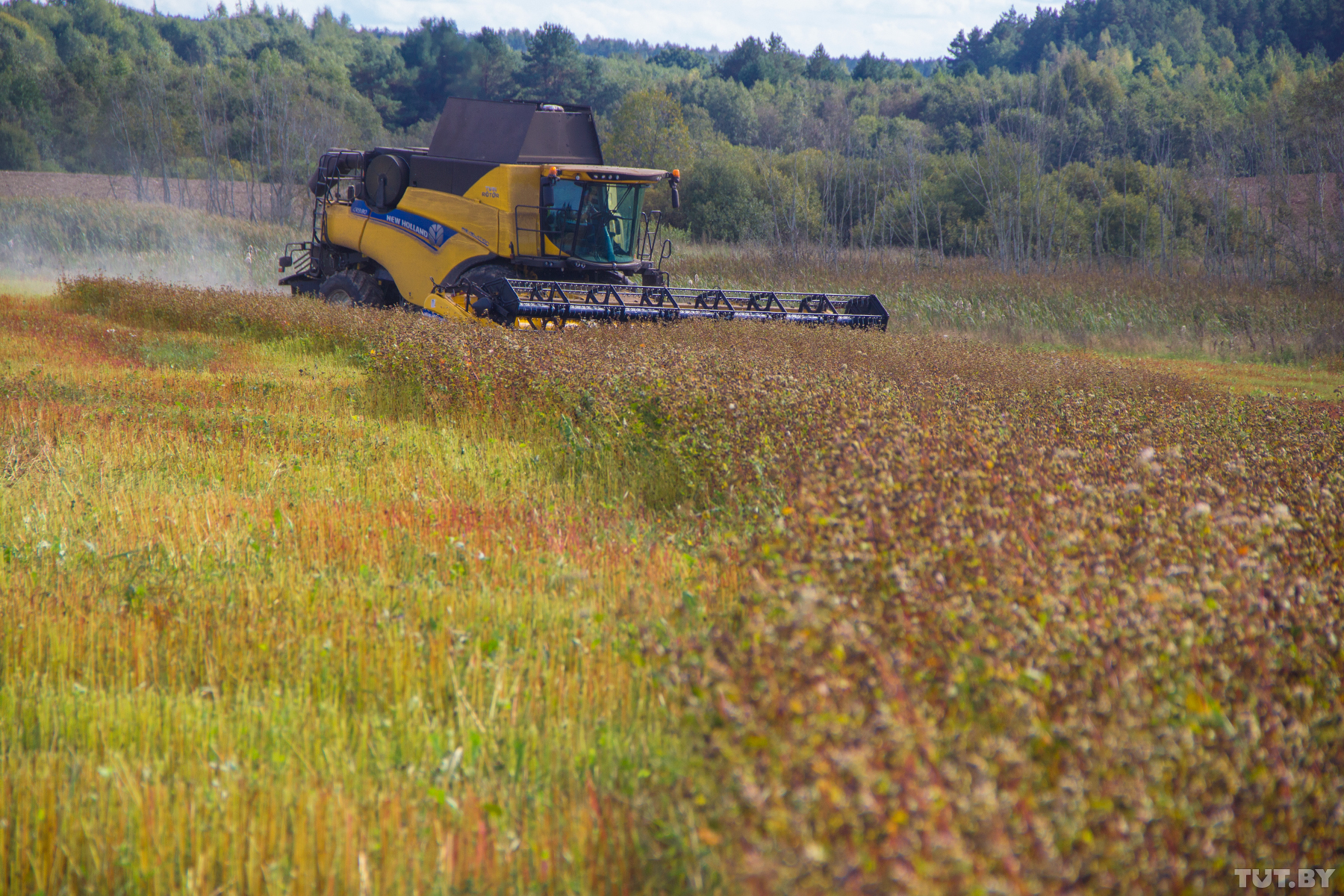 Гречишное поле убирает огромный комбайн New Holland
