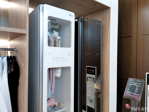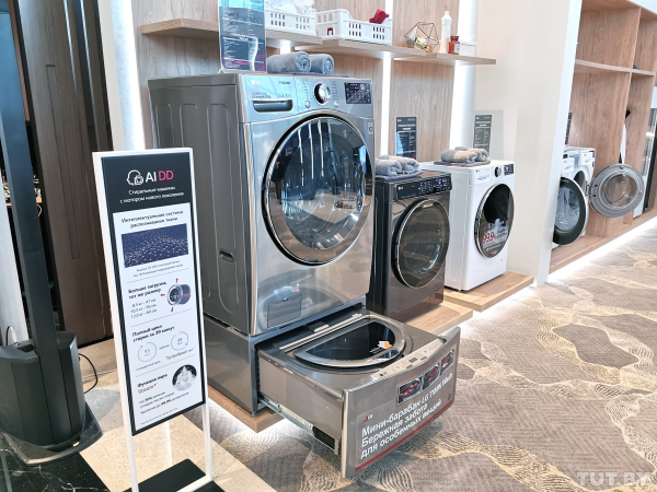 Кроме телевизоров и холодильников, в выставочной зоне представили довольно традиционный комплект бытовой техники вроде стиральных машин с двумя барабанами TwinWash или парового шкафа Styler.