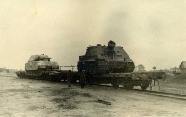 Также на соседней платформе вместе с Maus замечен еще один редкий представитель немецкой бронетехники — САУ «Штурмтигр». Всего в 1943—1945 годах было построено 18 «Штурмтигров», включая прототип.