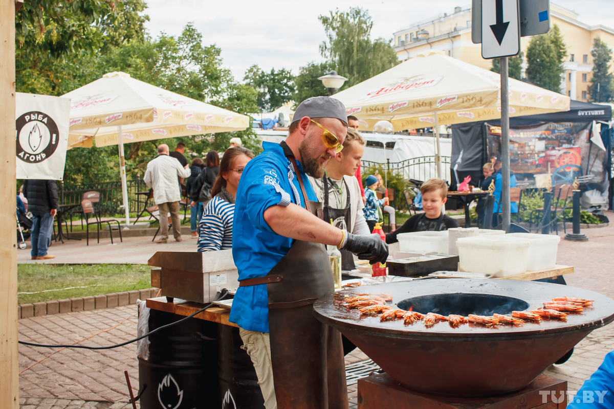 Ребята из палатки «Рыба Агонь» из Калининграда готовят на гриле из лангустинов, корюшки, скумбрии (от 8 до 12 рублей). Дороговато, но все, кто пробовал, восхищаются: «А рыбка тут и правда — „агонь“!».