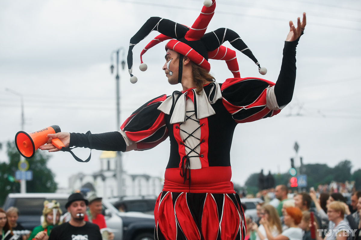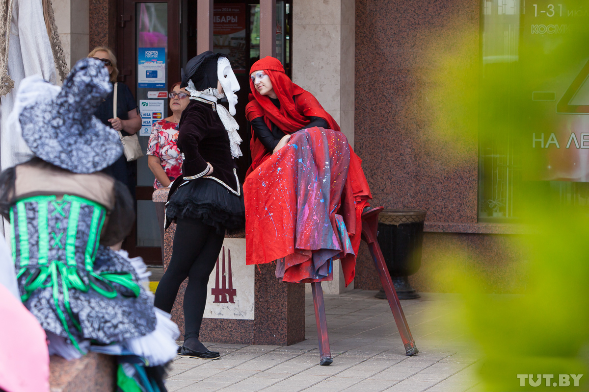 На «Славянке» можно встретить самую разную публику — тут уже давно никто никого не шокирует ни внешним видом, ни своими перформансами. Но вот группа мужчин с флагами, которая стояла в центре города, напротив Летнего амфитеатра, накануне открытия «базара», все же удивила видавший виды фестивальный Витебск.