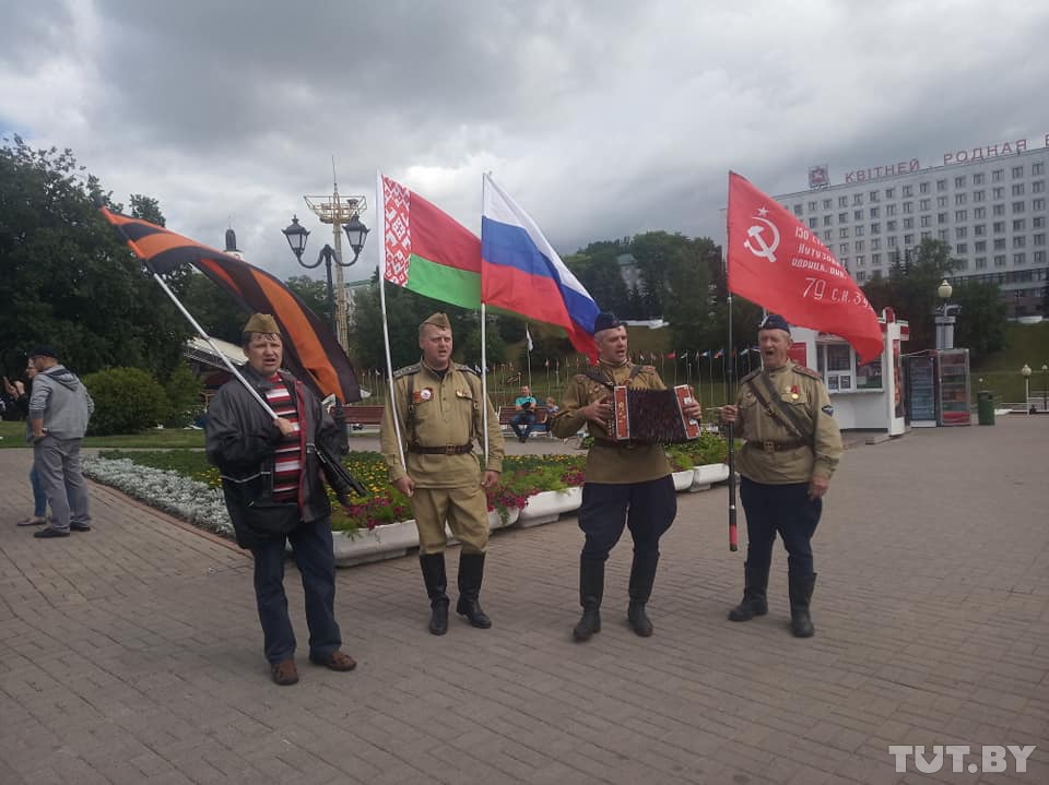 По сути, это был пикет. Четверо мужчин держали государственные флаги Беларуси, России, с георгиевскими полосами, а также копию одного из знамен времен Великой Отечественной. Они пели под гармошку «Катюшу» и другие песни военных лет. Рядом женщина, к одежде которой приколот значок движения «НОД» («Национально-освободительное движение»), собирала подписи — под обращением к Владимиру Путину с просьбой восстановить СССР.