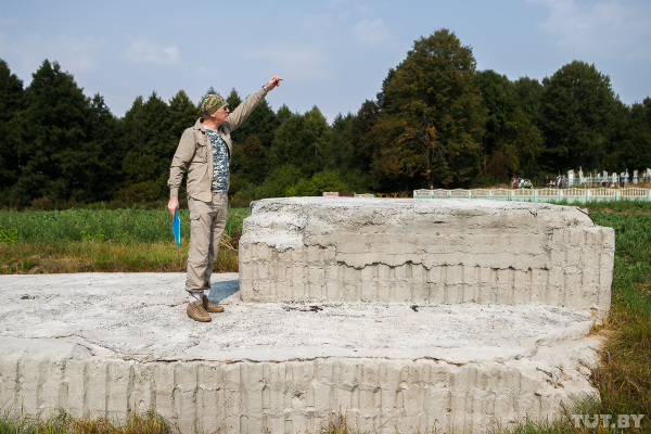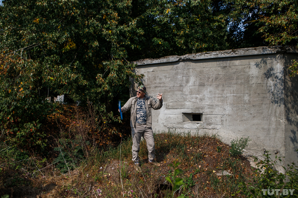 Александр Базарнов у польского «сарая». Бетонная надстройка появилась уже после войны. Поляки пристроили этот дот к немецкому убежищу.