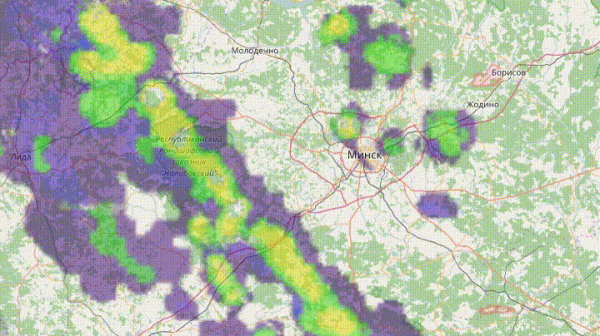 Сервис «Яндекса» показывает, где в ближайшие два часа будет идти дождь и сверкать молнии.