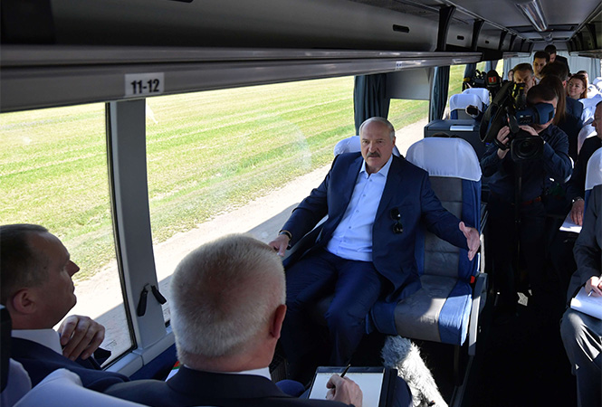 Вместе с президентом в автобусе были руководители Минска и Минской области Анатолий Сивак и Анатолий Исаченко, глава Администрации президента Наталья Кочанова, председатель Комитета госконтроля Леонид Анфимов, вице-премьер Владимир Кухарев и другие чиновники, а также журналисты.