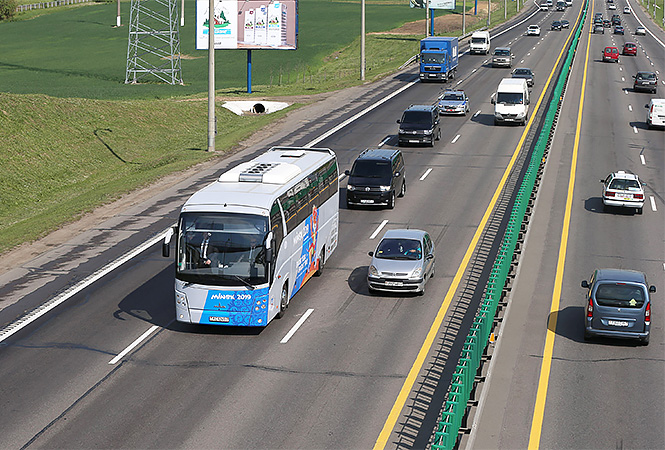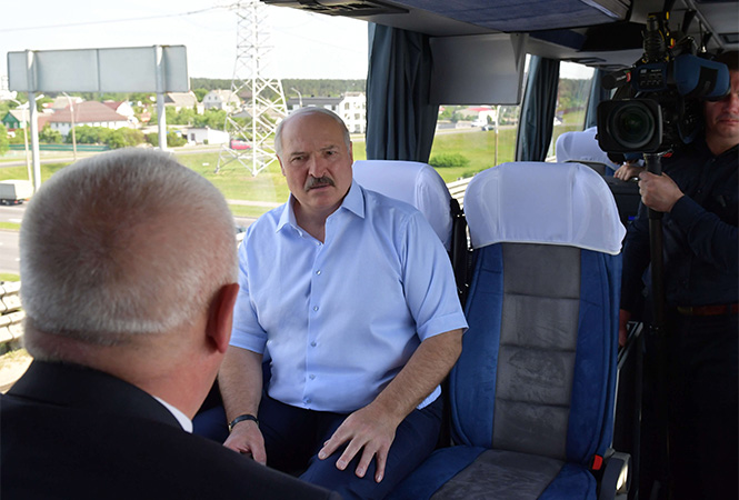 Сегодня Александр Лукашенко ознакомился с обустройством Минской кольцевой автодороги, а также благоустройством и развитием прилегающих территорий. Он прокатился по МКАД на автобусе с символикой II Европейских игр. Во время поездки президент дал поручения по содержанию территории вдоль МКАД, а также сделал несколько остановок, в том числе и в Куропатах, сообщает пресс-служба главы государства.