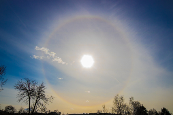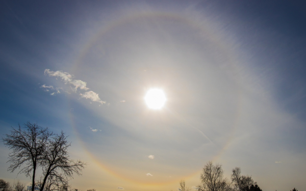 Хотя морозы отступили, 24 марта в небе можно было наблюдать оптический феномен — гало. Вокруг Солнца отчетливо показалось яркое светящееся кольцо довольно большого диаметра.