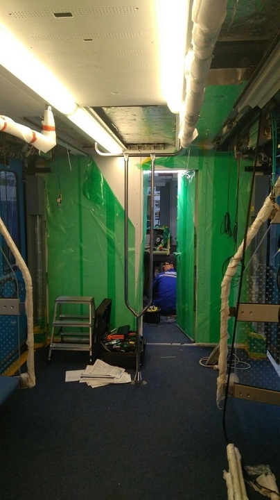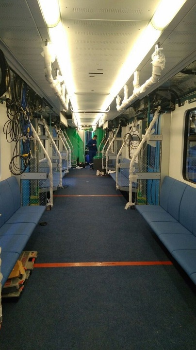На фотографиях — работа над внутренней отделкой вагонов, предположительно — для третьей линии минского метро. Синие кресла вдоль стен, темный пол, сквозной проход между вагонами, о котором рассказывали раньше на предприятии «Штадлер Минск».
