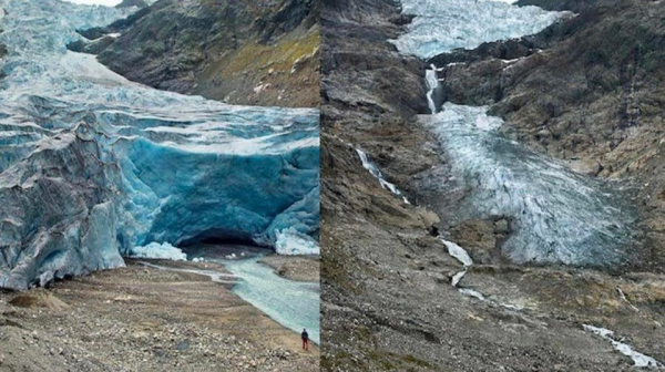 Фото справа показывает современное состояние ледника. На портале фолловеры обнаружили оригиналы снимков. Приближение показало, что льда в реальности еще меньше, чем кажется на коллаже.