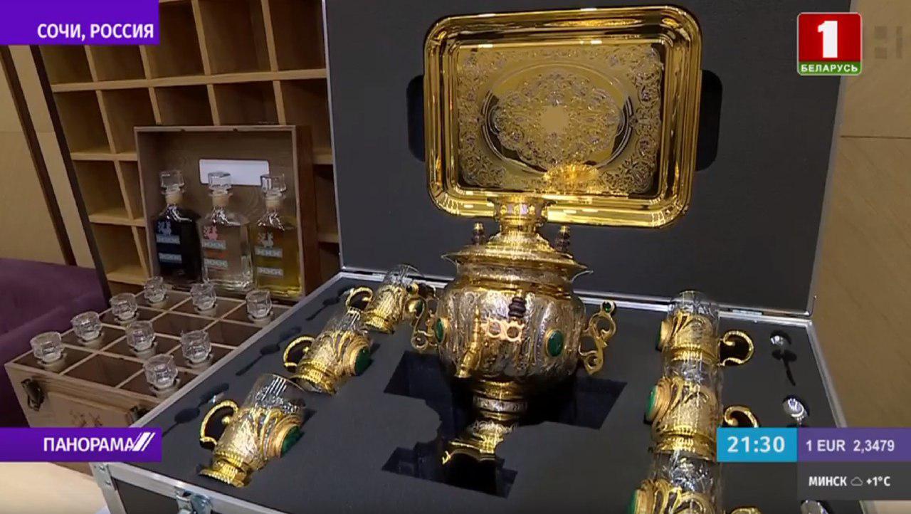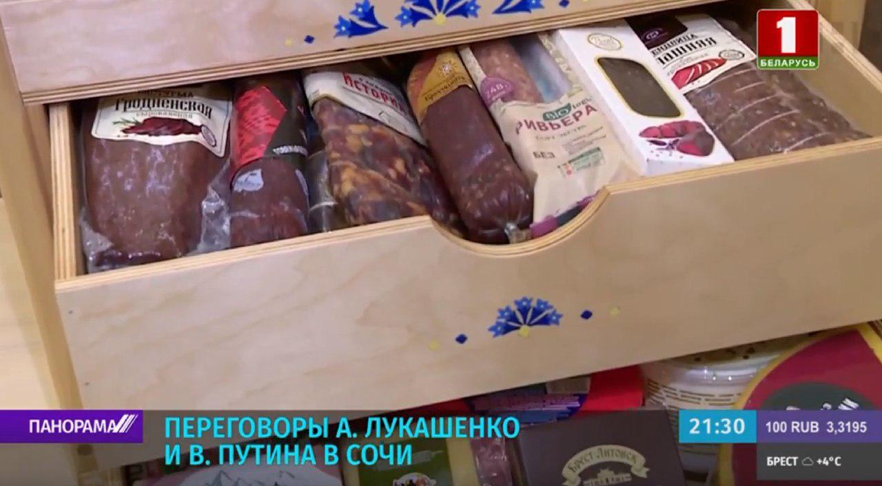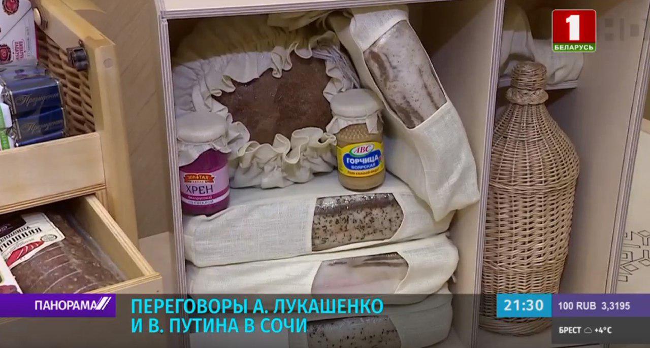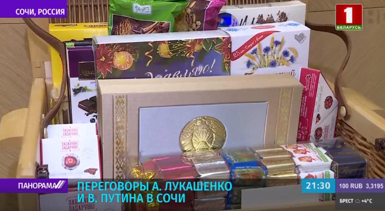 Во время переговоров в Сочи Александр Лукашенко и Владимир Путин обменялись подарками. Белорусский президент подарил президенту России продуктовый набор. В нем было сало, колбаса, сыр, конфеты, клюква в сахаре, хрен, горчица, хлеб, бутылка в плетеной упаковке. Владимир Путин же подарил белорусскому президенту самовар для чаепития «в русском стиле».