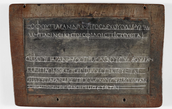 На восковой табличке — урок греческого языка. На ней написано «Ты должен принимать советы только от мудрых людей» и «Ты не можешь доверять всем своим друзьям». Ученикам нужно было переписать этот текст. В верхней части — пример, написанный учителем, а нижние строки — попытки ученика скопировать предложения.
