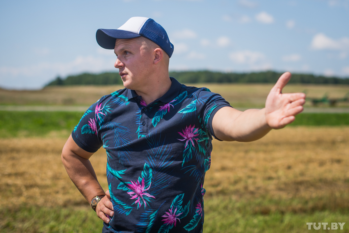 Одновременно на полях работает 22 комбайна, за рулем которых 22 пилота-профессионала. Среди них есть настоящие знаменитости, которые из года в год становятся лучшими в областных и республиканских соревнованиях по уборке зерновых. С огромного зеленого «Джон Дира» (марка зерноуборочного комбайна. — Прим. TUT.BY) ко мне перед заходом на новый круг «на минуточку» спускается Святослав Панкевич — механизатор с 20-летним стажем.