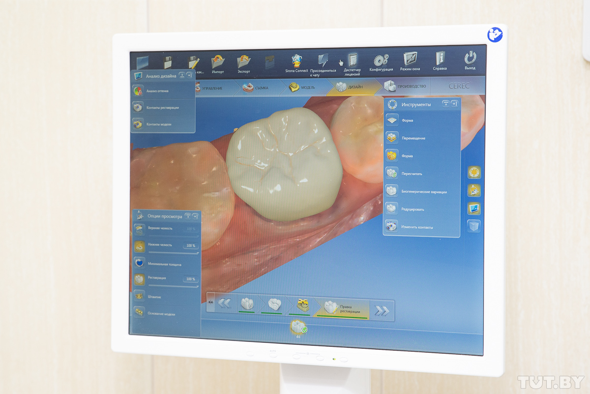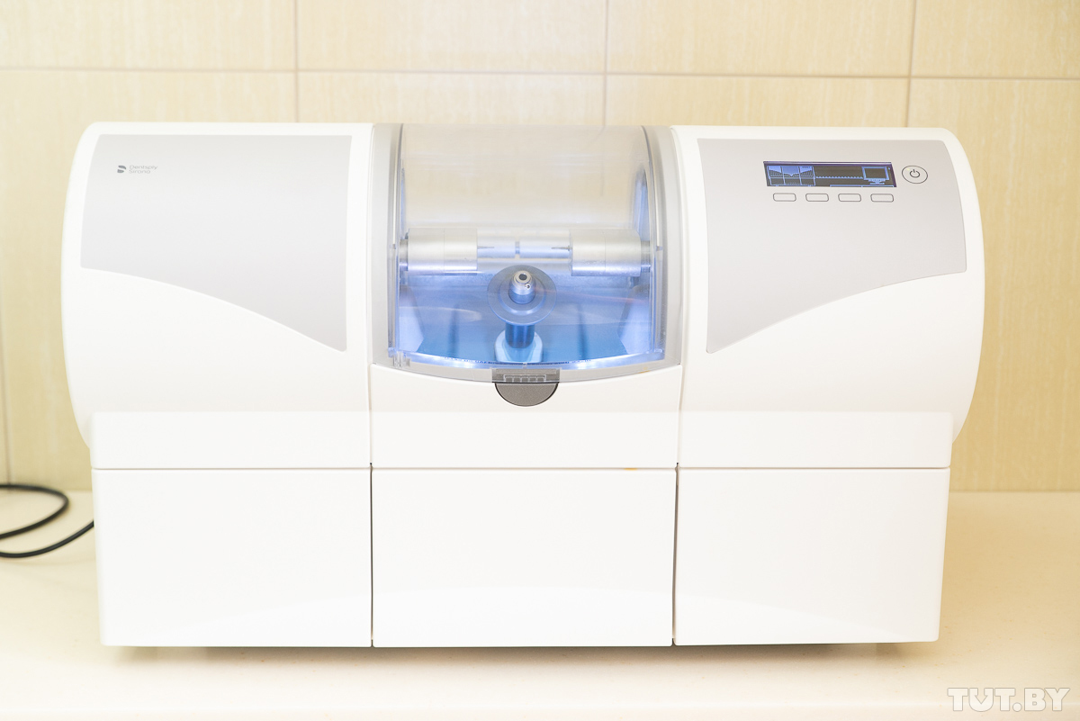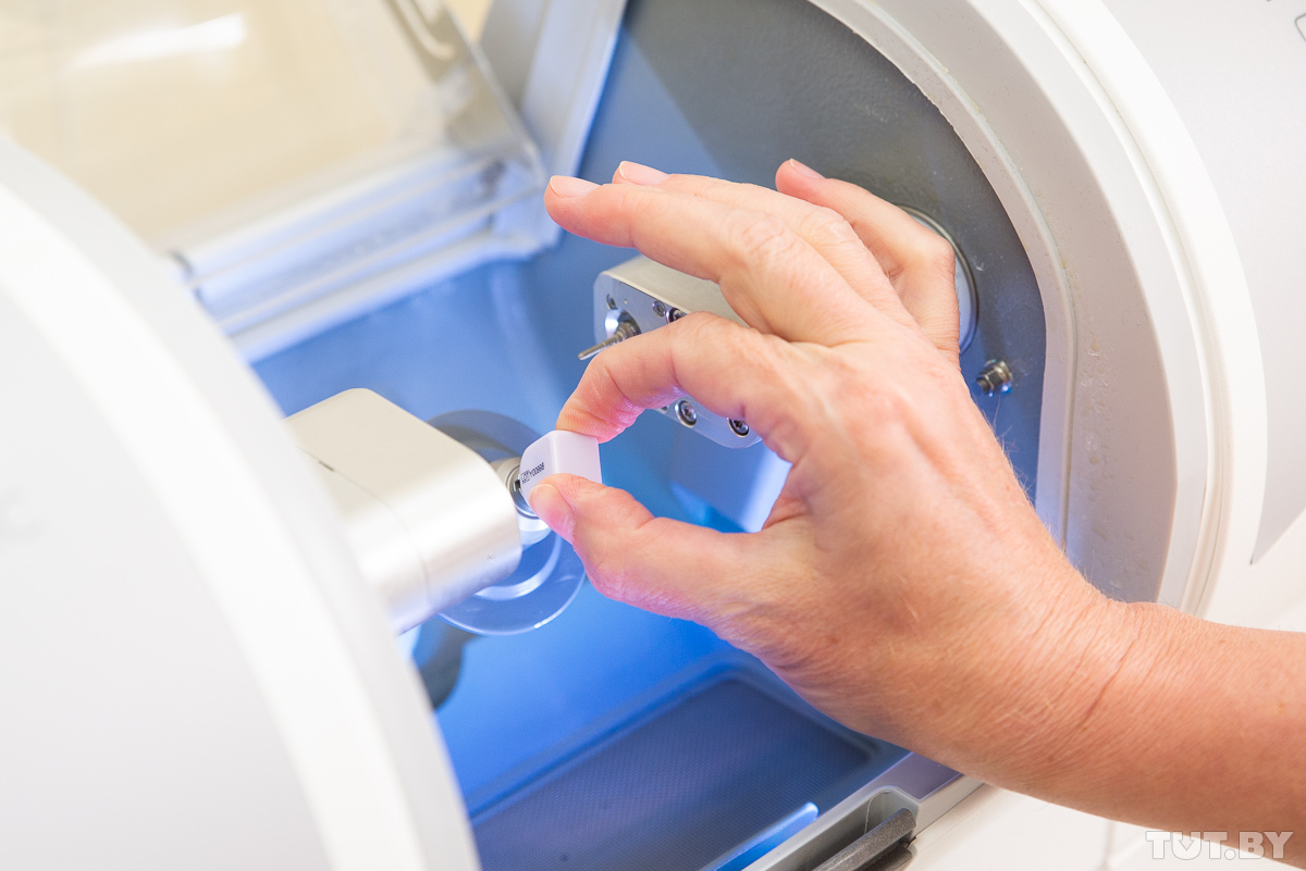 Пока стоматолог работает с программой, пациент может выйти из кресла, отдохнуть, сходить в кафе, например. Моделирование на компьютере помогает до минимума сократить подготовительный этап. Когда нужные параметры заданы, в игру вступает фрезер: из специальной болванки аппарат выпиливает нужную конструкцию. На всю процедуру он тратит около восьми минут.